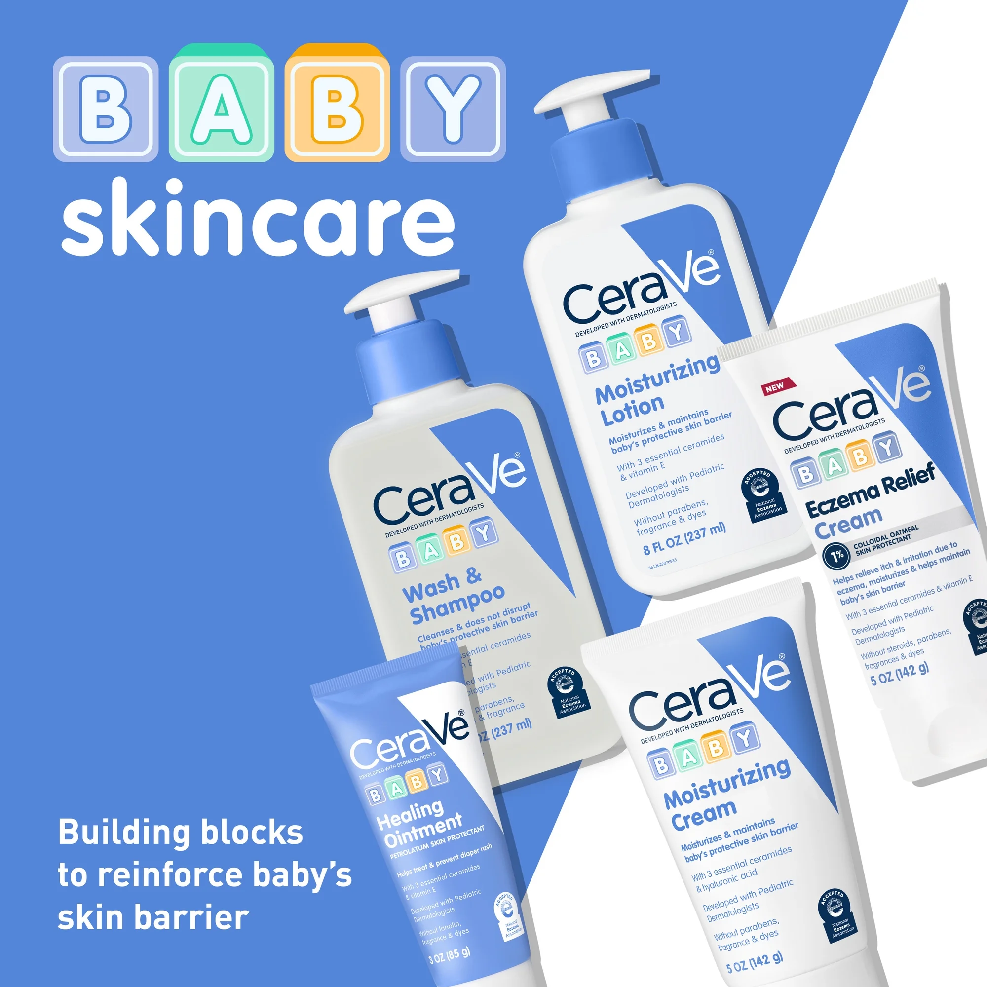Developed with pediatric dermatologists, Baby Moisturizing Lotion delivers soothing and moisturizing benefits for baby’s delicate skin while providing long-lasting hydration throughout the day. This non-greasy, lightweight baby lotion spreads easily on delicate skin to deliver three essential ceramides that help maintain the skin barrier as it develops. Enhanced with niacinamide, hyaluronic acid and vitamin E, our fragrance-free and paraben-free baby lotion locks in hydration throughout the day. Accepted by the National Eczema Association, this product is suitable for sensitive baby skin; eczema prone skin for babies’, toddlers’, and children’s face and body skin care.