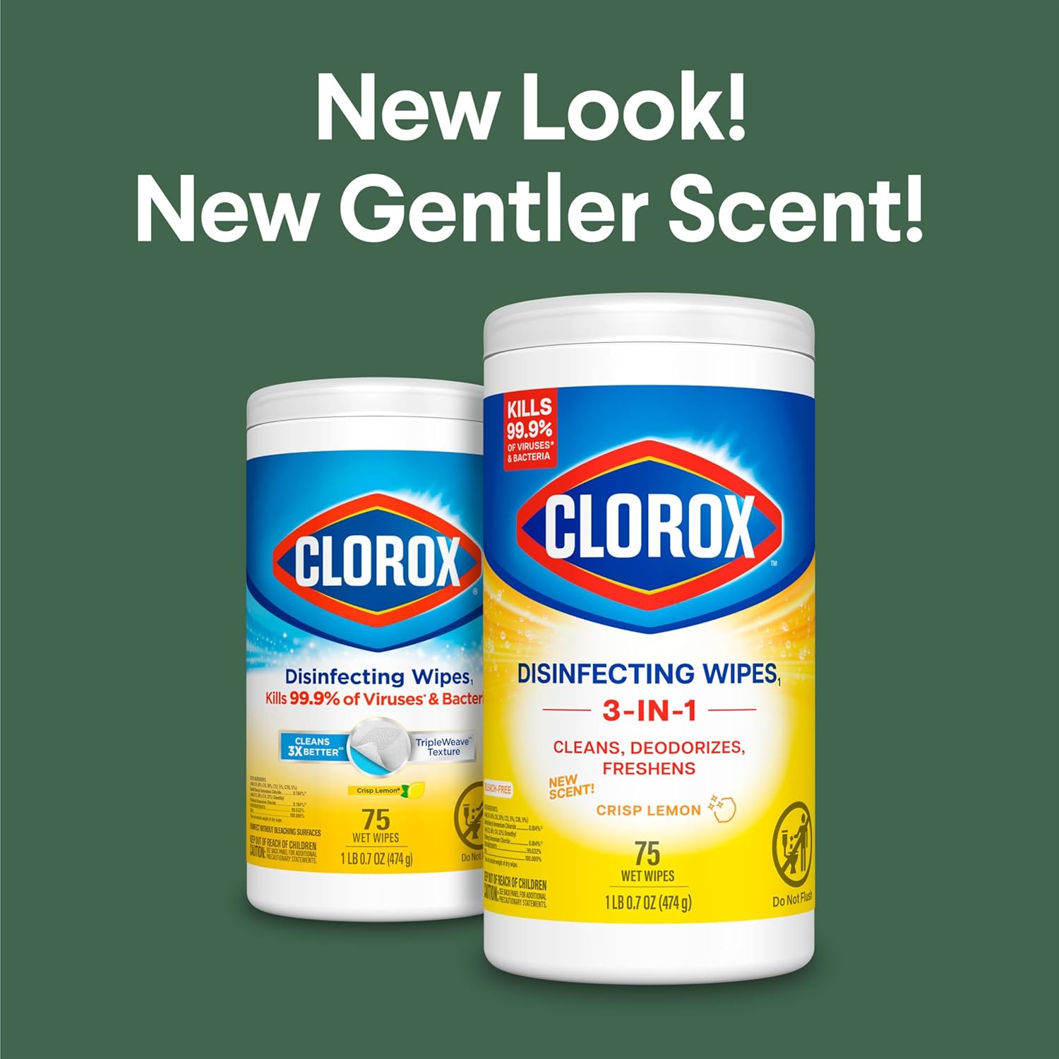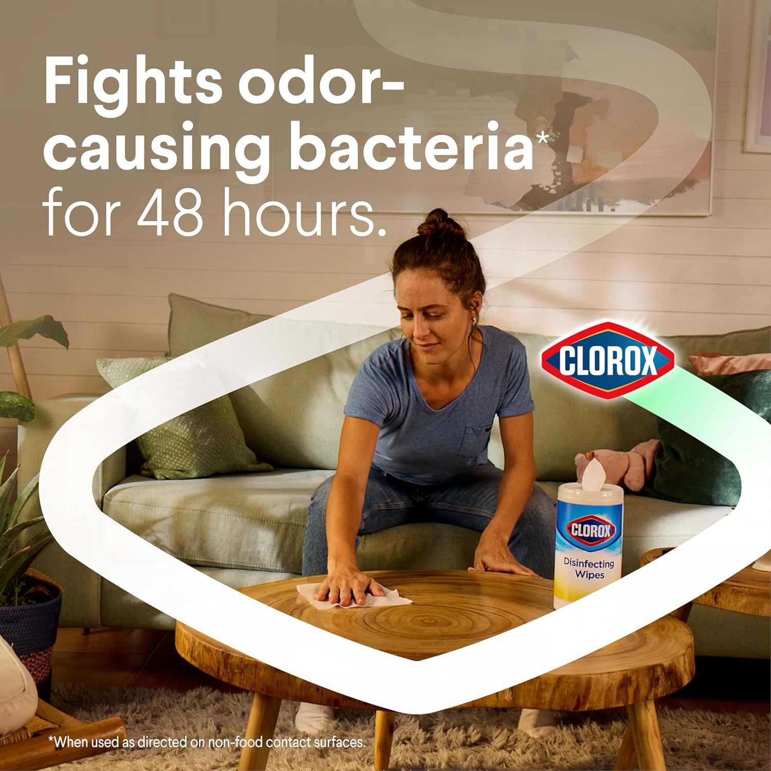 Clean feels good when you clean with Disinfecting Cleaning Wipes, now with new sparkling scents for daily use. These wipes deliver an effective clean and sparkling scent with every wipe. Safe to use on over 100 surfaces, including finished wood, sealed granite, glass and stainless steel, the Disinfecting Wipes you know and trust are ideal for the kitchen, bathroom, and high touch areas. Enjoy a Crisp Lemon scent while these bleach free wipes fight odor causing bacteria for up to 48 hours on non food contact surfaces, when used as directed. Tackle messes effortlessly with Disinfecting Wipes that clean 3X better than a wet paper towel, allowing you to clean more with just one wipe (1). Disinfecting Wipes kill 99.9% of germs, including Pseudomonas aeruginosa, Salmonella enterica and Staphylococcus aureus when used as directed on hard, nonporous surfaces. (1) Vs. a wet paper towel against egg, toothpaste and dirt. (2) On non food contact surfaces, when used as directed.